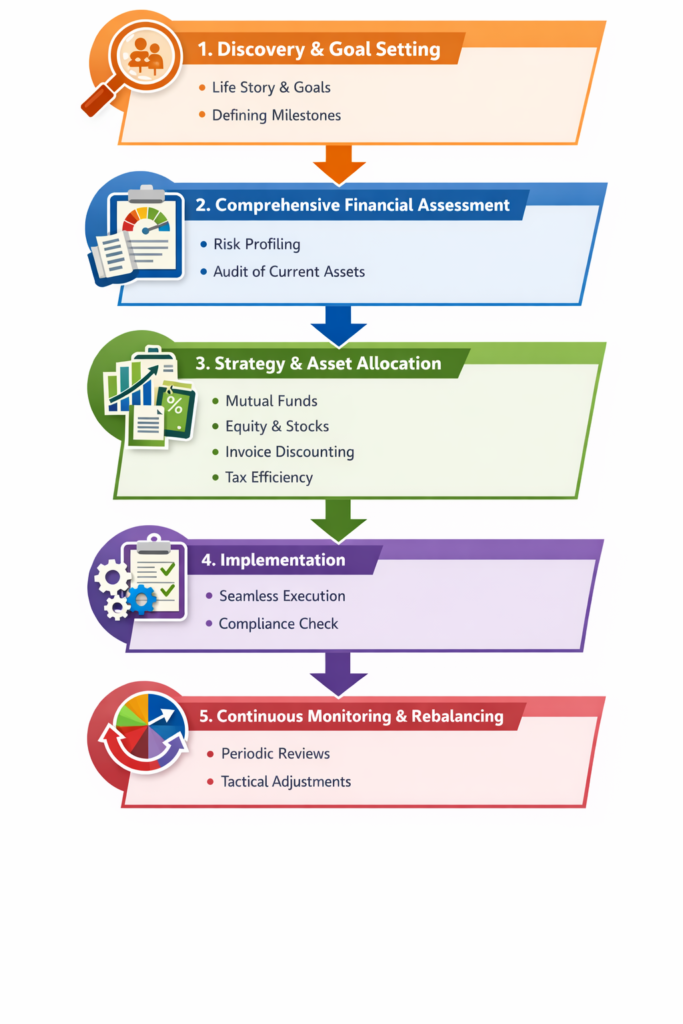 - Seamless Execution: Once you approve the plan, we handle the heavy lifting—opening accounts, setting up SIPs, and initiating Invoice Discounting transactions